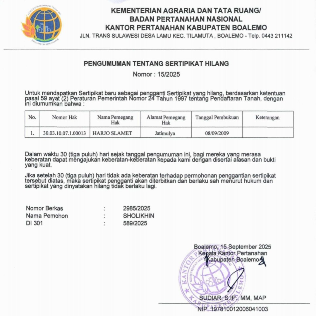 ETNIK MEDIA.ID, BOALEMO – Kementerian Agraria dan Tata Ruang/Badan Pertanahan Nasional melalui Kantor Pertanahan Kabupaten Boalemo, resmi mengumumkan kehilangan sertipikat tanah milik warga. Pengumuman tersebut tertuang dalam surat Nomor 15/2025, yang diterbitkan pada 15 September 2025.